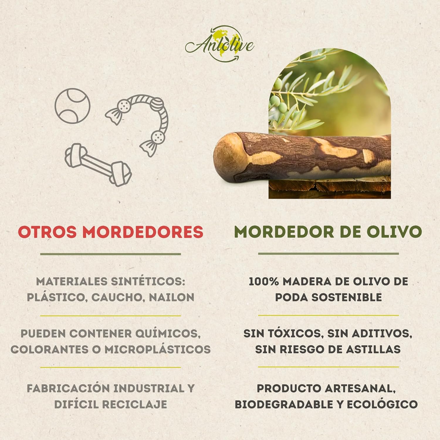 Dile adiós a los juguetes de plástico y a los palos peligrosos. Nuestro mordedor natural para perros, elaborado de forma artesanal en España, está hecho con auténtica madera de olivo, una de las más duras y resistentes de la naturaleza.